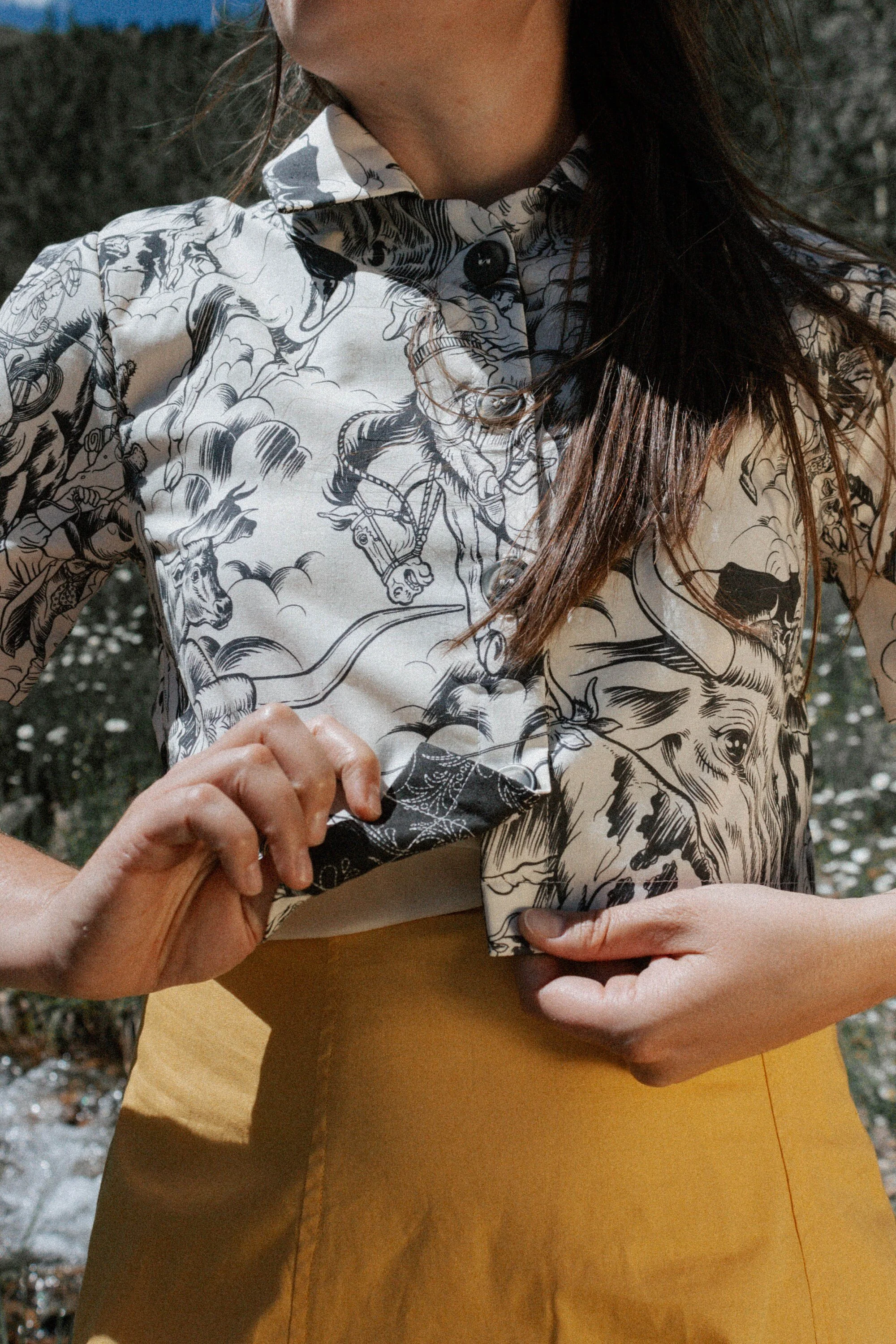 Western Slope Shorty button-up collection-- This line of button-up shirts is modestly cropped for a vintage feel and is named after the Western Slope of Colorado. The Western Slope is full of rich history, including lots of old west mining lore, cattle ranchers, and cowboys, thus the inspiration behind this line of shirts. We wanted to create a western shirt that goes back to the 40’s and 50’s western style, which is our personal favorite. The colorways offered in this little line are all 40’s and 50’s repro prints, and we used mostly vintage buttons as well. These shirts are somewhat unisex, but may be a little more cropped depending on height and build.