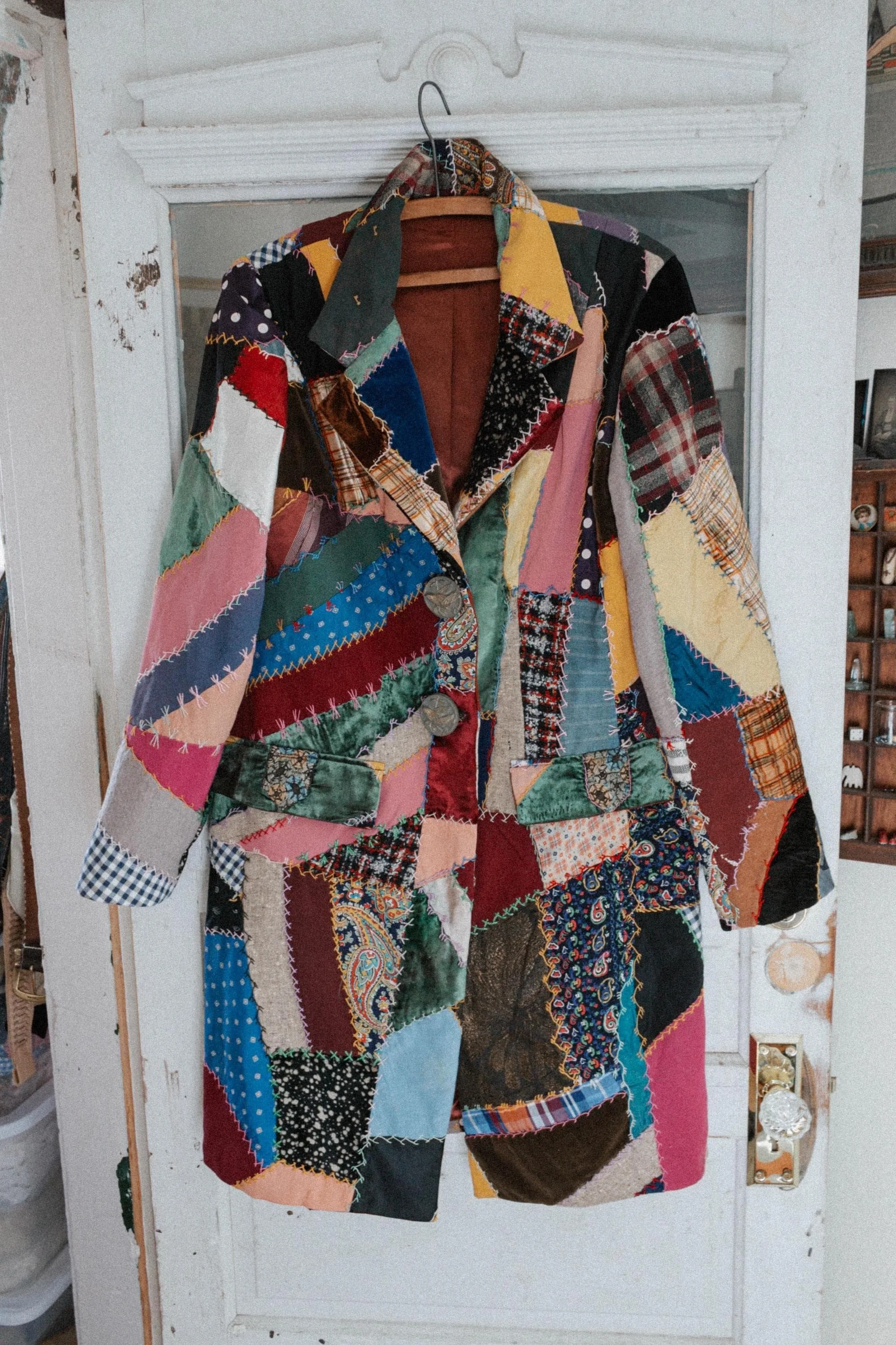 Kvennfolk original coat made with an exquisitely detailed 30’s/40’s crazy quilt. The crazy quilt is made with rayon, velvet, and wool scraps, all brightly colored and patterned. They were all sewn together with decorative stitches and decorated with little gold keys throughout. There were two spiderweb embroidered pieces that we used for the pocket flaps. For the buttons we decided on a couple one-of-a-kind Victorian painted carved wood bird buttons. The coat is lined with a rich rusty red-orange upcycled satin curtains.